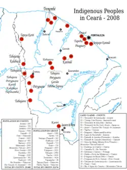 O Ceará era habitado ancestralmente por povos indígenas dos troncos Tupi (Tabajara, Potyguara, Tapeba, entre outros) e (Kariri, Inhamum, Jucá, Kanindé, Tremembé, Karatius, entre outros), cujas tribos ainda hoje denominam vários topônimos no estado.[22]