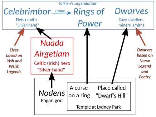 Em 1928, um templo de culto pagão do século IV foi escavado em Lydney Park, Gloucestershire.[15] Tolkien foi convidado a analisar uma inscrição em Latim no local: "Para o deus Nodens. Silvianus perdeu um anel [en] e doou metade [de seu valor] a Nodens. Entre aqueles chamados Senicianus, não permita saúde até que o devolva ao templo de Nodens."[16] O nome antigo do lugar era "Colina dos Anões", e em 1932, Tolkien, como filólogo profissional, relacionou Nodens ao herói irlandês Nuada Airgetlám, "Nuada da Mão de Prata".[T 7][2]