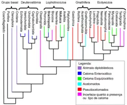 Animais acelomados, pseudocelomados e celomados estão espalhados pelo grupo dos Metazoa, assim como o tipo de formação do celoma, se por esquizocelia ou enterocelia[1][3].