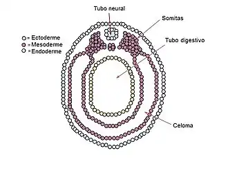 Na gastrulação, em animais triploblásticos, as três camadas germinativas (Ectoderme, endoderme e mesoderme) são formadas a partir de uma blástula que é caracterizada pela presença de uma camada de blastoderme, células interiores e uma cavidade única, a blastocele. Nos animais acelomados a mesoderme preenche totalmente a blastocele, consequentemente a cavidade celômica é inexistente. No desenvolvimento dos pseudocelomados as células da mesoderme migram e forram somente a periferia da blastocele. Já nos celomados, a blastocele é revestida completamente por células da mesoderme[1].