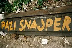 - ↑ Originalmente, escrito: Pazi, Snajper!.[22]