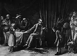 Ilustração de Fred Bernard de Charles Dickens a trabalhar na fábrica de graxa para sapatos depois de o seu pai ter sido enviado para a prisão de devedores. Publicada na edição de 1892 de Life of Charles Dickens de John Forster.