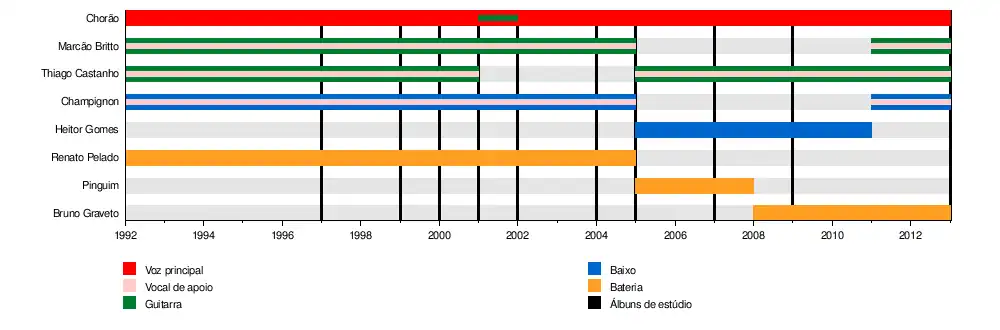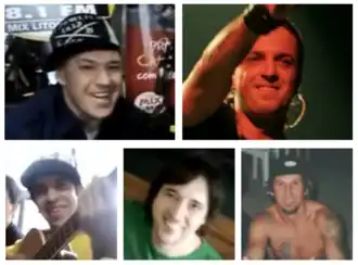 ![]() A formação original da banda. Acima: Chorão e Thiago Castanho; abaixo: Champignon, Marcão Britto e Renato Pelado. | |