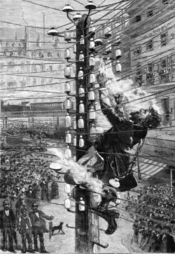 Ilustração de uma pessoa recebendo uma descarga elétrica no alto de um poste de energia.
