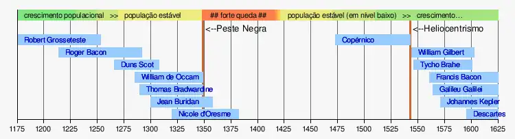 Em 1348, a Peste Negra levou este período de intenso desenvolvimento científico a um fim repentino.[29] A praga matou um terço da população europeia. Por quase um século, novos focos da praga e outros desastres causaram contínuo decréscimo populacional. As áreas urbanas, geralmente o motor das inovações intelectuais, foram especialmente afetadas.[30]
