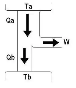 Na figura 1 mostraremos a energia e a temperatura em e respectivamente, que durante cada ciclo do motor, a substância de trabalho absorve a energia sob a forma de calor de um reservatório térmico mantido a temperatura constante e libera a energia sob a forma de calor para um segundo reservatório térmico mantido a uma temperatura inferior, também constante .
