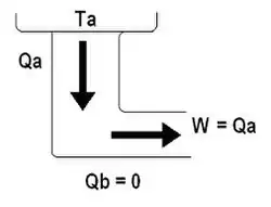Observação: um rendimento igual a 100% (figura 4), como idealizavam os inventores, é fisicamente impossível: para o rendimento máximo, todo calor que vem da fonte quente deveria ser convertido em trabalho. Isto só ocorreria se a temperatura da fonte fria fosse zero absoluto.