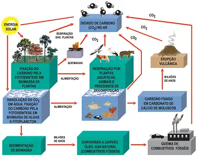 Na ausência da influência antropogênica (causada pelo homem), no ciclo biológico existem três reservatórios ou "stocks": terrestre (20.000 Gt), atmosfera (750 Gt), oceanos (40.000 Gt). Este ciclo desempenha um papel importante nos fluxos de carbono entre os diversos stocks, através dos processos da fotossíntese e da respiração.