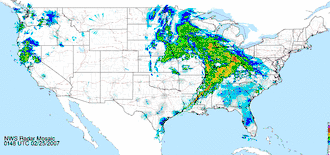 Linhas de tempestade ou bandas sólidas de fortes temporais podem se formar à frente das frentes frias e de cavados devido à presença de umidade atmosférica significativa e, também, de forte divergência de altos níveis, levando à formação de granizo e de fortes ventos.[56][57] Quando existe significativo cisalhamento do vento à frente de uma frente fria, na presença do jet stream de altos níveis, é possível a formação de tornados.[58] Embora os tornados possam se formar em qualquer lugar da Terra, o maior número de tais fenômenos ocorre nas Grandes Planícies dos Estados Unidos devido ao vento descendente que segue de norte para o sul orientado pelas Montanhas Rochosas, que pode levar à formação de uma frente de ponto de orvalho, ou seja, à formação de uma região limítrofe entre o ar úmido e o ar seco sem que haja diferenças de temperatura ou de pressão atmosférica, ajudando no desenvolvimento dos tornados de qualquer intensidade.[59]