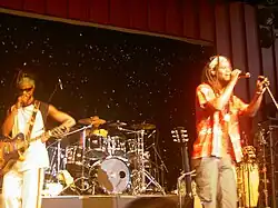 ![]() Cidade Negra em 2005. Da esquerda para a direita: Da Ghama, Lazão (ao fundo, na bateria) e Toni Garrido. Bino Farias não aparece na imagem. | |