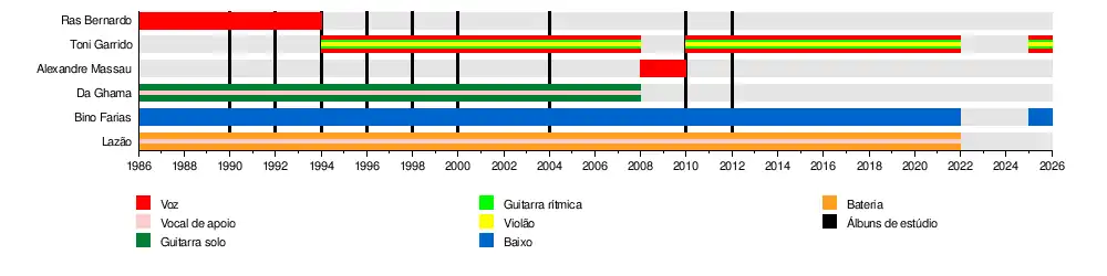 - Toni Garrido – voz, guitarra rítmica e violão (1994–2008; 2010–2022; 2025-presente)