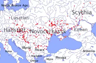- Mapa da distribuição das descobertas de artefatos "cimérios" de bronze na Europa