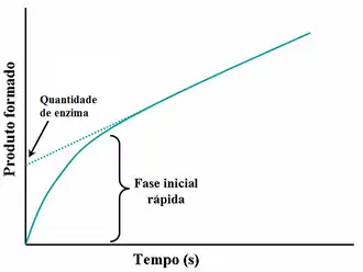 Na figura da direita, pode-se observar como a enzima passa rapidamente a um estado intermédio E* durante os primeiros segundos da reacção. Posteriormente, quando é alcançado o estado estacionário, a velocidade diminui. Esta primeira fase da reacção proporciona a taxa de conversão da enzima. Portanto, a quantidade de produto liberado durante esta fase (que pode obter-se prolongando a recta correspondente ao estado estacionário até cortar o eixo y) também dá a quantidade de enzima funcional presente no ensaio.[28]