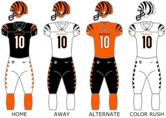 As cores do time dos Bengals eram laranja, preto e branco, e seus capacetes eram de um tom semelhante de laranja, com as únicas variações sendo a palavra "Bengals" em letras maiúsculas pretas (com um contorno branco) em ambos os lados do capacete, sem nenhuma faixa no capacete. O Cincinnati Bengals eram os únicos na NFL que não tinham números nos uniformes das camisas (chamados números de TV) até a temporada de 1980, quando apareceram nas mangas. Nesse mesmo ano, a equipe mudou a cor da máscara do capacete de cinza para preto. A equipe não descartou seus uniformes semelhantes a Cleveland até 1981. Durante esse ano, um design uniforme único foi introduzido. Embora a equipe mantivesse camisas pretas, camisas brancas e calças brancas, eles agora estavam enfeitados com listras laranja e pretas de tigre. A equipe também apresentou os capacetes laranja com listras de tigre preto que ainda estão em uso hoje.