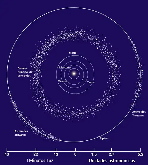 • Troianos: encontram-se perto dos pontos de Lagrange de Júpiter (situados a 60° da linha que une o Sol e Júpiter). São conhecidos ao redor de 4 000.[49] Por vezes também são classificados neste grupo alguns asteroides situados nos pontos de Lagrange de Neptuno ou Marte, como é o caso de 5261 Eureka. Recebem este nome devido ao primeiro asteroide deste grupo descoberto, 588 Aquiles, herói da Guerra de Troia.[50]