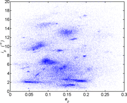 Gráfico que representa a inclinação orbital respeito da excentricidade. Podem ser observadas regiões com uma maior acumulação de asteroides; trata-se das chamadas famílias.