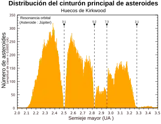 Ao representar numa gráfica a distância dos asteroides ao Sol, podem ser observadas regiões sem asteroide algum. Estas lacunas coincidem com as órbitas onde existe ressonância orbital com Júpiter, ou seja, onde o período da órbita é relacionado mediante uma fração simples com o período de Júpiter. Por exemplo, qualquer asteroide situado a uma distância de 3,28 UA, teria uma ressonância 2:1 com Júpiter; quando o asteroide completa duas voltas em redor do Sol, Júpiter completa uma. Outras ressonâncias importantes são as correspondentes a 3:1, 5:2 e 7:3, a distâncias de 2,5 UA, 2,82 UA e 2,96 UA, respectivamente.[27] Também existem outras ressonâncias secundárias, como a ressonância 8:3 (semieixo maior de 2,71 UA), nas quais, embora não se encontrem vazias, o número de asteroides é menor. O cinturão principal pode ser dividido então em três zonas separadas por estas lacunas: Zona I (2,06-2,5 UA), Zona II (2,5-2,82 UA) e Zona III (2,82-3,28 UA).[42]