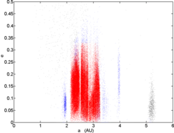 Representação da excentricidade dos asteroides respeito da sua distância ao Sol. Os pontos vermelhos e azuis formam o cinturão principal. Pode ser observado que a excentricidade média se situa em torno de 0,15.