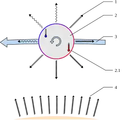 Esquema do efeito Yarkovsky, mostrando a assimetria da emissão de radiação infravermelha num asteroide.