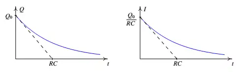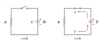 A figura ao lado mostra o diagrama de circuito para um capacitor, com carga inicial , que é descarregado ligando-o a uma resistência . Esse circuito é designado de circuito RC. O instante em que o capacitor é ligado à resistência corresponde ao instante em que é fechado o interruptor no diagrama de circuito da figura baixo. Quando o capacitor começa a descarregar, a corrente nele será igual à taxa de diminuição da sua carga, .