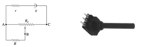 Diagrama de circuito de um divisor de voltagem e fotografia de um potenciómetro.