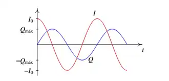 Assim, a corrente e a carga oscilam com frequência , desfasadas de forma que quando uma delas for nula, a outra terá o seu valor absoluto máximo (figura ao lado).