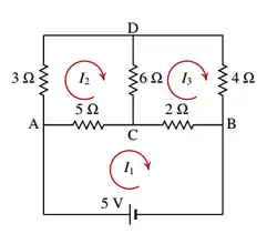 Usaremos esse circuito da figura à direita para mostrar o fundamento do método das malhas. Na resolução de problemas não será preciso realizar a mesma análise que vamos fazer a seguir, mas bastará com aplicar as regras enunciadas no fim da seção, para escrever a matriz do circuito.[7]