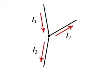 A primeira lei, a lei dos nós, ou lei das correntes, consiste em que em qualquer ponto de um circuito onde exista separação da corrente (nó), a diferença entre a soma das correntes que entram no ponto e a soma das correntes que saem é igual a zero. Por exemplo, no nó representado na figura ao lado, há uma corrente a entrar no nó, e duas correntes e a sair.