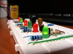 Os elementos de circuitos são produzidos com um tamanho padrão para facilitar sua montagem. Uma forma rápida de montar circuitos é usar uma placa de teste. Para construir circuitos mais duradouros, pode-se usar uma placa de circuito (Protoboard), que é constituída de um material isolador com furos e com pistas paralelas de cobre em um dos lados; o contato entre diferentes componentes é feito inserindo os terminais em furos que estejam na mesma pista, tal como na placa de teste, mas é preciso soldar os terminais sobre o cobre. Outro método que permite construir circuitos mais compactos, são as placas de circuito impresso (PCB). Um PCB é semelhante a uma placa de circuito, mas as pistas de cobre e os furos são desenhados sob medida para cada circuito específico.