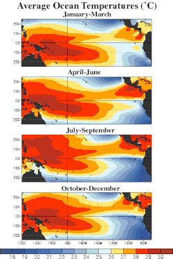 - ↑ Zelle, Hein, Gerrian Appledoorn, Gerritt Burgers, and Gert Jan Van Oldenborgh (março de 2004). «Relationship Between Sea Surface Temperature and Thermocline Depth in the Eastern Equatorial Pacific». Journal of Physical Oceanography. 34: 643. Bibcode:2004JPO....34..643Z. CiteSeerX 10.1.1.12.3536