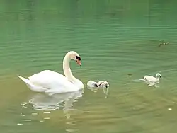 Um cisne-branco com seus filhotes.