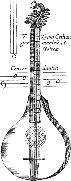 Ilustração de um cistre (chamado cythara Italica et Germanica para distinguir de outros instrumentos chamados "cítara"), da obra Musurgia Universalis de Athanasius Kircher