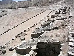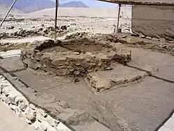 A arquitetura monumental foi construída com pedras extraídas e paralelepípedos do rio. Usando "sacos de shicra" de junco, alguns dos quais foram preservados,[34] trabalhadores teriam transportado o material para os locais à mão. Roger Atwood da revista Archaeology descreve o processo: