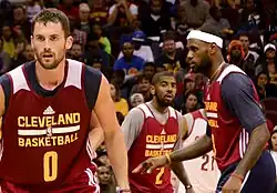 Kevin Love (esquerda), Kyrie Irving (centro) e LeBron James (direita), o Big Three que liderou os Cavaliers ao seu primeiro título da NBA em 2016.