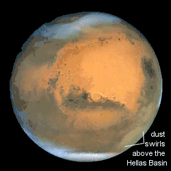 Quando a sonda Mariner 9 aterrissou em Marte em 1971, o mundo esperava ver novas imagens em detalhes da superfície marciana. Ao invés disso, o que se viu foi uma tempestade de poeira em escala quase planetária[23] em que apenas o massivo vulcão Olympus Mons podia ser visto acima da neblina. A tempestade durou um mês, desde então constatou-se que se trata de uma ocorrência muito comum em Marte. Em 26 de Junho de 2001, o telescópio espacial Hubble observou o início de uma tempestade de poeira em Hellas Planitia, uma região de Marte (na imagem à direita). Um dia depois a tempestade "explodiu" e se tornou um evento global. Essa tempestade de poeira elevou a temperatura da atmosfera em 30°C. A baixa densidade da atmosfera marciana implica que sejam necessários ventos de 18 a 22 m/s para elevar a poeira da superfície, mas devido à ausência de umidade em Marte o pó pode permanecer na atmosfera durante muito mais tempo que na Terra, onde a chuva remove as partículas suspensas na atmosfera. A estação seguinte àquela tempestade apresentou temperaturas 4°C abaixo da média. Tal variação foi atribuída à cobertura global de poeira gerada pela tempestade, que aumentou temporariamente o albedo de Marte.[24]