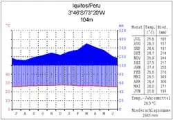 Climograma da localidade amazónica peruana de Iquitos. Veja-se a regularidade térmica e de precipitação. O maior pico de precipitação ocorre em Março e o segundo em Novembro.