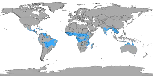 Os climas tropicais de savana são mais comumente encontrados na África, Ásia e norte da América do Sul. O clima também é predominante em partes da América Central, norte da Austrália, ilhas do Pacífico e sul da América do Norte, especificamente em seções do México e do estado da Flórida, nos Estados Unidos, e algumas ilhas do Caribe. No Brasil, o clima tropical de savana é encontrado no interior da região Nordeste do país e no noroeste do estado de São Paulo. A maioria dos lugares que têm esse tipo de clima são encontrados nas margens externas da zona tropical, mas ocasionalmente uma localização tropical interna também se qualifica. Da mesma forma, a costa do Caribe, a leste do Golfo de Urabá, na fronteira Colômbia-Panamá até o delta do rio Orinoco, no Oceano Atlântico (cerca de 4.000 quilômetros), tem longos períodos de seca (o extremo é o clima do tipo BSh), caracterizado por uma precipitação muito baixa, não confiável, presente, por exemplo, em extensas áreas da península de La Guajira, no oeste da Venezuela, e nas penínsulas setentrionais na América do Sul, que recebem precipitação anual total inferior a 300 mm, que cai praticamente toda em dois ou três meses. Esta condição estende-se às Pequenas Antilhas e Grandes Antilhas, formando o cinturão seco da circunvalação. O comprimento e a severidade da estação seca diminuem no interior (sul); na latitude do rio Amazonas - que flui para o leste, ao sul da linha equatorial - o clima lá é equatorial (tipo Af). A leste dos Andes, entre o árido Caribe e a sempre úmida Amazônia estão os Llanos ou savanas do rio Orinoco, de onde esse clima leva seu nome.