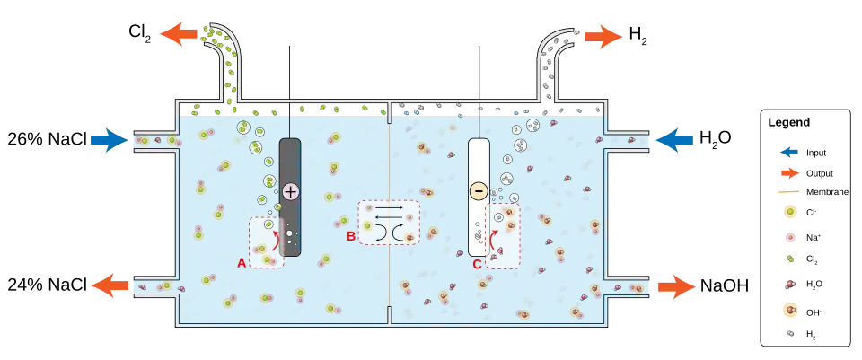 A indústria do cloro-álcali é um grande consumidor do orçamento energético mundial. Este processo converte soluções concentradas de cloreto de sódio em cloro e hidróxido de sódio, que são utilizados para produzir muitos outros materiais e compostos químicos. O processo envolve duas reações paralelas: