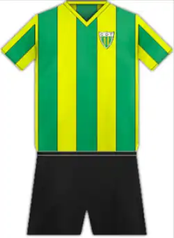 Camisola: listada na vertical de cores amarela e verde;