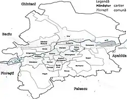 A cidade é composta por 15 distritos (cartiere) divididos radialmente, alguns com suas próprias estruturas administrativas locais, e a prefeitura procura desenvolver as estruturas administrativas locais para a maioria destes distritos.