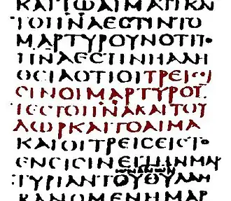 Em I João 5:6 há uma variante textual, "δι' ὕδατος καὶ αἵματος καὶ πνεύματος" ("por meio de água e sangue e espírito"), que também ocorre no Codex Alexandrinus, 104, 424c, 614, 1739c, 2412, 2495, ℓ 598m, syrh, copsa, copbo e em Orígines.[52] Bart D. Ehrman afirma que esta variante é uma leitura corrompida pelo grupo ortodoxo,[53] uma tese amplamente disputada no meio acadêmico.[54]