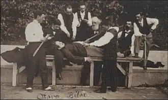 Coelho Netto "operando" Artur de Azevedo, numa encenação que imita a Lição de Anatomia de Rembrandt - com Olavo Bilac (que assina), entre outros intelectuais que formaram o grupo fundador da ABL.