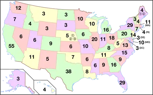 Nota: os residentes de territórios dos EUA como Porto Rico e Guam não votam nas eleições presidenciais e, portanto, não possuem representação no Colégio Eleitoral.[2]