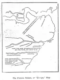 | “ | ...A evidência de que alguns dos Colonos Perdidos ainda estavam vivos por volta de 1610 em território Tuscarora é convincente. Um mapa do interior da região do que agora é a Carolina do Norte, desenhado em 1608 por Francis Nelson, residente em Jamestown, é o testemunho mais eloquente neste respeito. Este documento, o assim chamado "Mapa Zuniga",[5] informa que "4 homens vestidos com roupas que vieram de roonock" ainda estavam vivos na cidade de Pakeriukinick, evidentemente um sítio iroquês no Neuse." Também diz que, "...Por volta de 1609 havia rumores em Londres sobre ingleses de Roanoke vivendo sob o comando de um chefe denominado "Gepanocan" e aparentemente em Pakerikinick. Foi dito que Gepanocan mantinha quatro homens, dois garotos e, "uma jovem donzela" (Virginia Dare?) de Roanoke como artesãos..." | ” |