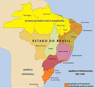 América Portuguesa, em 1766, com o Estado do Grão-Pará e Maranhão (em amarelo), o Estado do Brasil e a Colônia do Sacramento