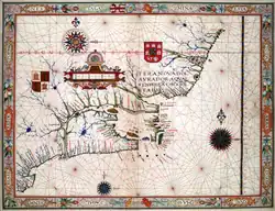 Mapa da costa leste do Canadá, feito por Fernão Vaz Dourado em 1570, onde se vê o escudo de Portugal e a inscrição: "Terra Nova do Lavrador, a qual senhoreã os Corte Reais"