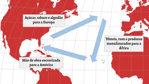 Representação do modelo clássico do comércio triangular: A Europa exportava têxteis e rum para África, que, em troca, fornecia mão de obra escravizada para as Américas, que, por sua vez, alimentavam a produção de açúcar, tabaco e algodão para a Europa.