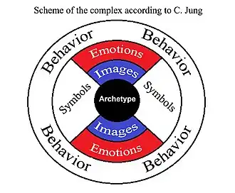 Jung costumava usar o termo "complexo" para descrever um agrupamento parcialmente reprimido, mas altamente influente, de material psíquico carregado, separado ou em desacordo com o "eu" consciente.[19] Daniels (2010) descreveu os complexos como "aglomerações 'presas' de pensamentos, sentimentos, padrões de comportamento e formas somáticas de expressão". Em relação à sua natureza como tonificada por sentimento, Jung escreveu "[um complexo] é a imagem de uma certa situação psíquica que é fortemente acentuada emocionalmente e, além disso, é incompatível com a atitude habitual da consciência. Essa imagem tem uma coerência interna poderosa, tem sua própria totalidade e, além disso, um grau relativamente alto de autonomia, de modo que está sujeita ao controle da mente consciente apenas em uma extensão limitada e, portanto, comporta-se como um corpo estranho animado na esfera da consciência."[20]