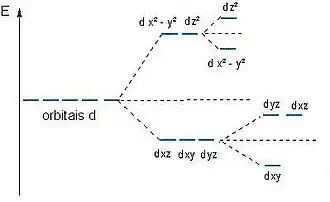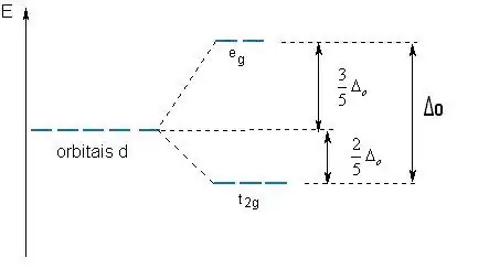 O principal efeito dos ligantes, segundo a Teoria do campo Cristalino (TCC), é o desdobramento dos níveis de energia correspondentes aos orbitais do átomo central. No caso mais simples, a interação do campo eletrostático gerado por seis ligantes idênticos distribuídos simetricamente ao redor do átomo central, simetria octaédrica (figura 1), resulta no aumento da energia dos orbitais e na perda da degenerescência destes níveis, ou seja, os orbitais do átomo central dividem-se em 2 níveis de energia, .[2]