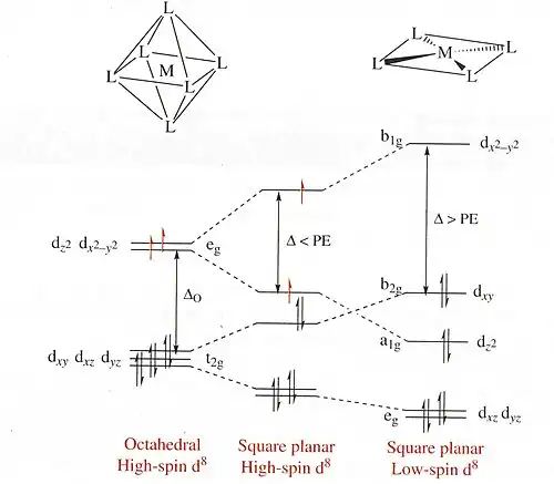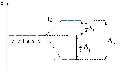 Alguns orbitais concentram-se em regiões mais próximas dos ligantes que os outros, e os elétrons preferirão ocupar os orbitais que estiveram mais longe do ligante, conforme indicado na figura 2. Neste caso considerando os orbitais dz² e dx²-y² com lobos mais concentrados nas vizinhanças dos ligantes e os orbitais dxy , dxz, dyz com lobos entre os ligantes obtém-se o seguinte diagrama de nível de energia: